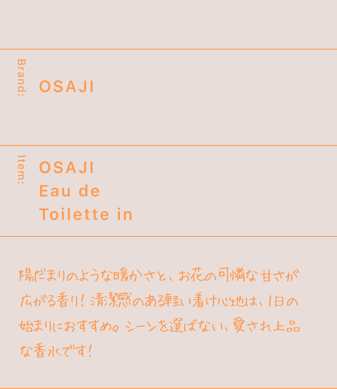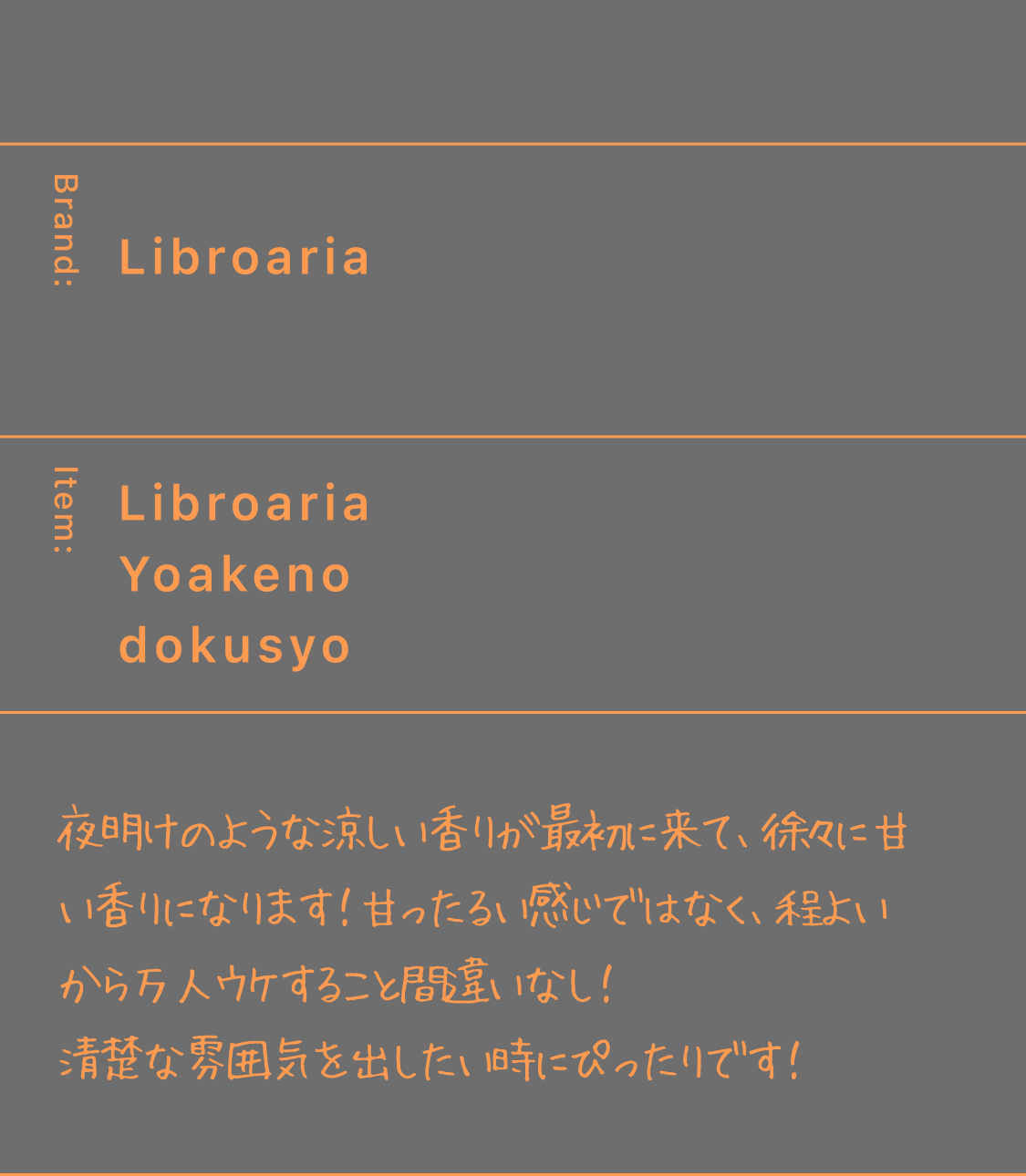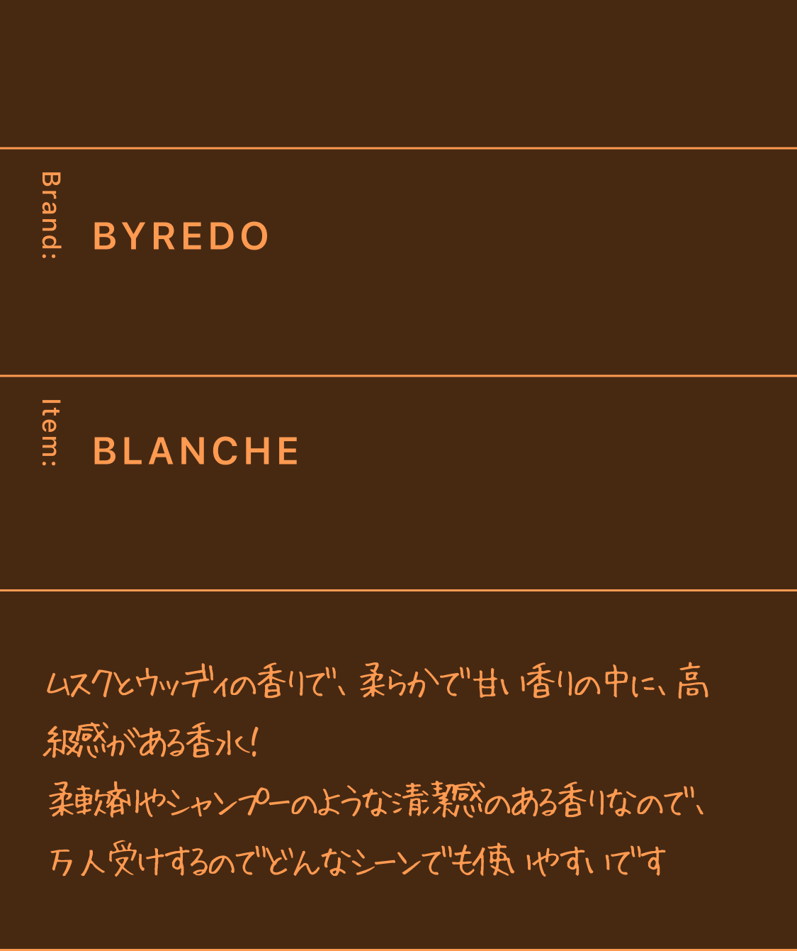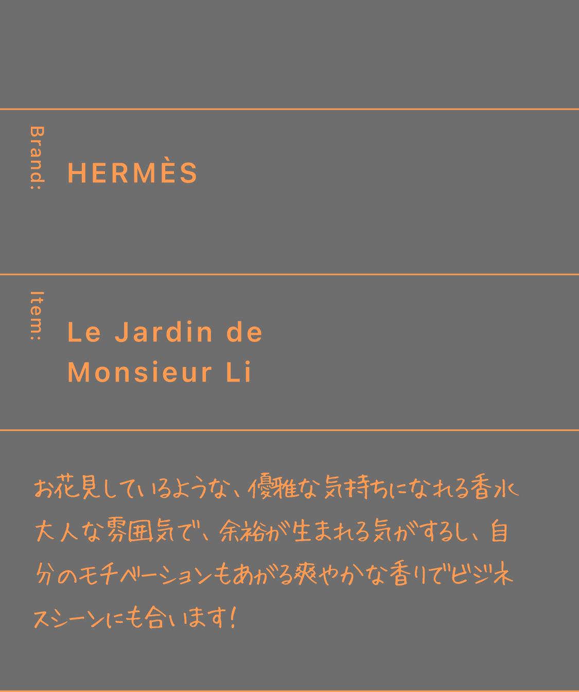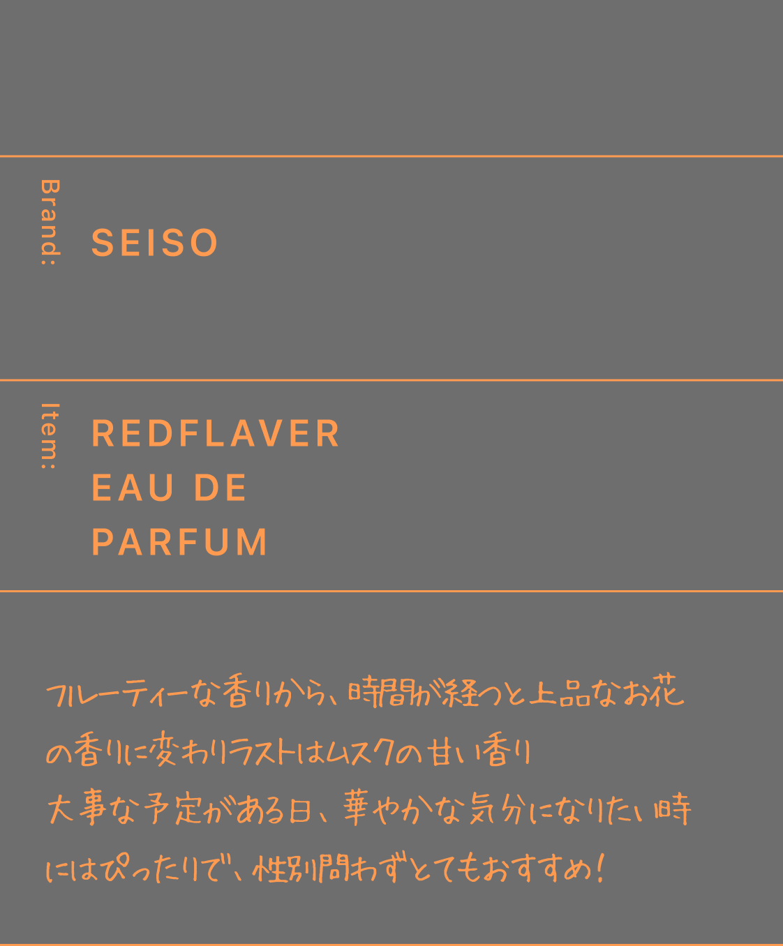 試してみたかったけど、買う勇気がなかったから、買って違うなってなった時の失敗感がなく手軽に色々な香りを楽しめてよかった。自分で良いなと思った香りと第三者から良いと言われる香水が違ったり、気分によって香りを変えられるのも良い点だと思った。